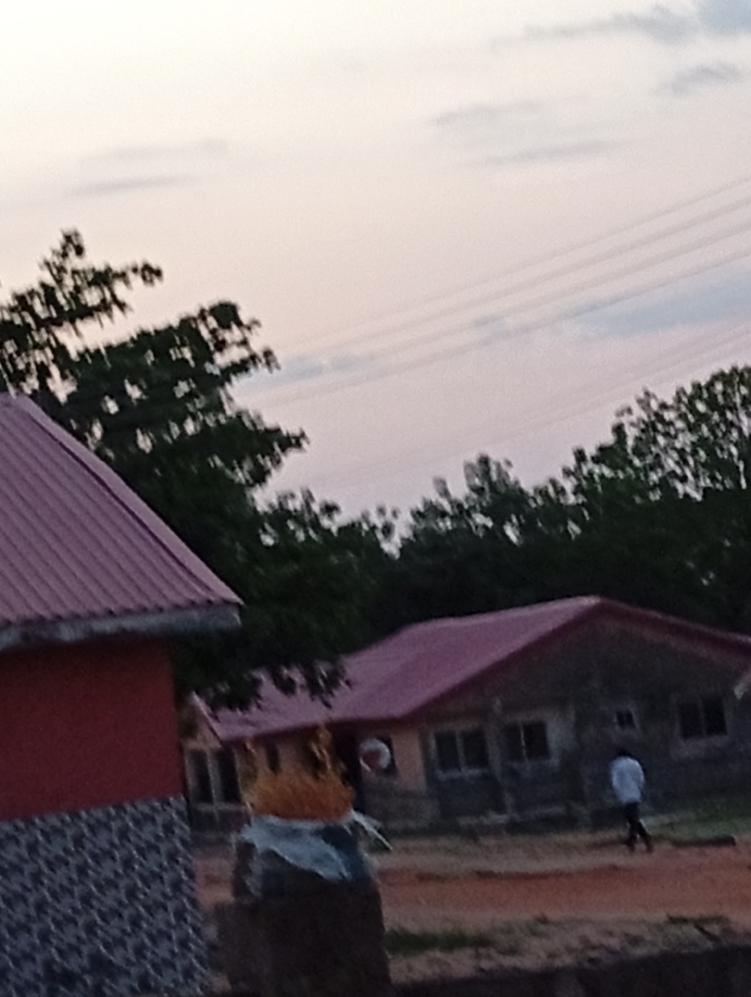 building in Adankolo, Nigeria, possibly at dusk. The building has a red roof and a gray exterior. Another building with a red roof and a textured exterior is partially visible on the left. A figure in a white shirt walks on a dirt path in front of the building. Trees are visible in the background and there are power lines in the sky.