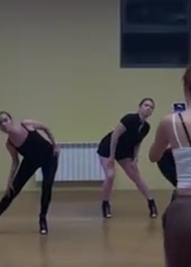 In a brightly lit dance studio, a group of women are rehearsing a dance routine. They are dressed in black outfits, with some wearing heels. The choreography involves arm movements and body rolls. A woman in a white tank top and brown sweatpants stands opposite the dancers and records them with her smartphone. The studio has yellow walls and a wooden floor. A radiator is visible along one wall, and there is a dark window high up on the wall.