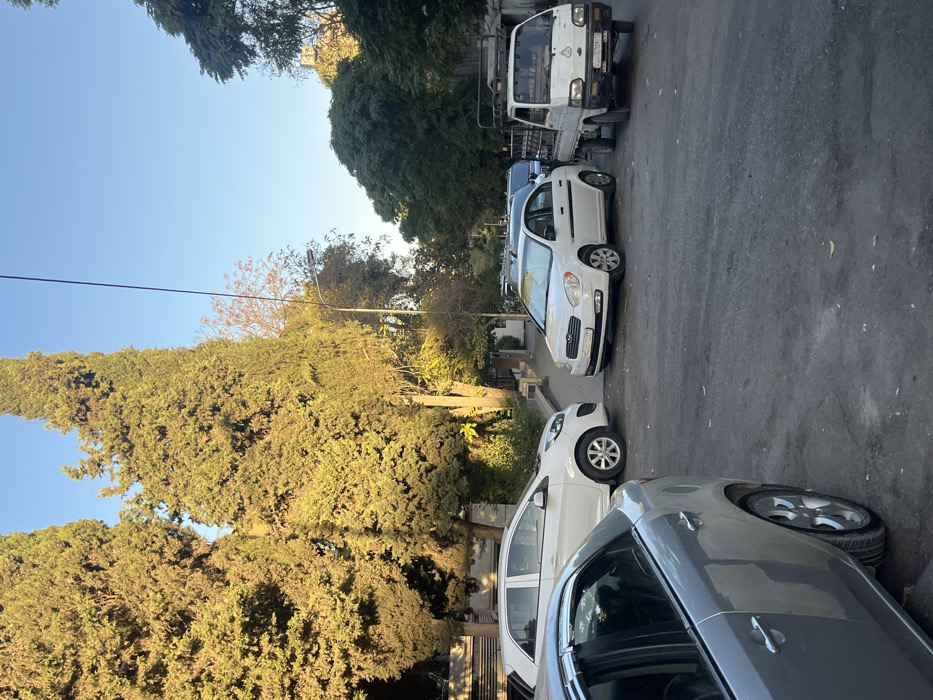 This image depicts a street scene in the city of Al-Muhajerin Municipality, Syria, under a clear blue sky. Direct sunlight illuminates the left side of the frame, casting shadows and highlighting the foliage. In the foreground, the rear-right section of a silver sedan is visible on a dark asphalt road surface. In the mid-ground, a white hatchback is parked partially on a sidewalk or curb, oriented towards the right. Adjacent to it, a white sedan (Hyundai Accent model) is parked facing the viewer, displaying a visible light-colored patch or tape on the passenger-side front bumper and a black side molding strip. To the right of the sedan, a white compact pickup truck with an exposed cargo bed and a mounted rack is parked, also facing the viewer. The asphalt road surface exhibits some visible patches and minor debris. The left side of the street is lined with several tall, slender evergreen trees, strongly illuminated by the sun. Further back and to the right, various other trees with dense green foliage are visible, partially obscuring distant buildings. A street light pole stands in the mid-ground, and a dark utility cable spans diagonally across the upper portion of the frame. No individuals are visible within the scene. All vehicles appear stationary.