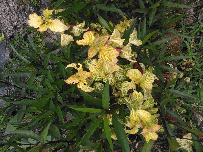 This image captures a close-up view of a dense vegetative growth located in Ciherang, Indonesia. The scene is dominated by two primary plant species. One species features numerous elongated, lanceolate leaves of a deep green color, with visible reddish-brown stems. Interspersed and somewhat entangled with this species is a second plant type characterized by smaller, variegated leaves exhibiting irregular patterns of chartreuse and pale yellow. Several of these variegated leaves display evidence of damage, including irregular perforations and curled margins. The plants are situated against a background composed of a textured, mottled grey surface, consistent with concrete or natural rock, with minimal patches of moss or small, dark green growth. The ground level at the base of the plants appears dark and indistinct. No human subjects, animals, or observable actions are present.