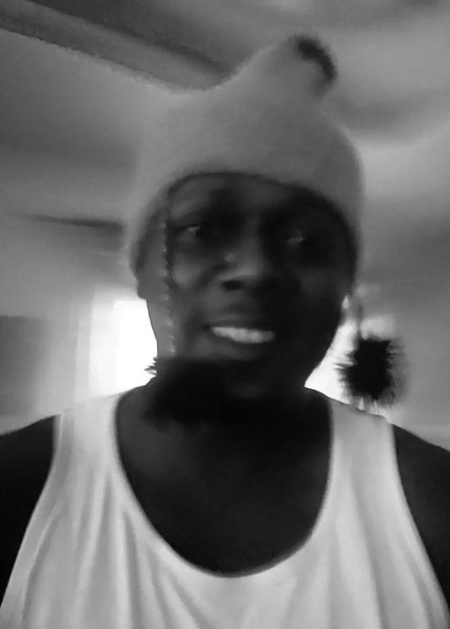 A black and white, low-angle shot depicts a person wearing a white tank top and a knit beanie with pompoms. The person's face is partially obscured due to motion blur, but a smile and visible teeth are evident. The environment appears to be indoors, with blurred objects suggesting movement or a low-light setting. The image is slightly rotated, giving a dynamic feel to the scene.
