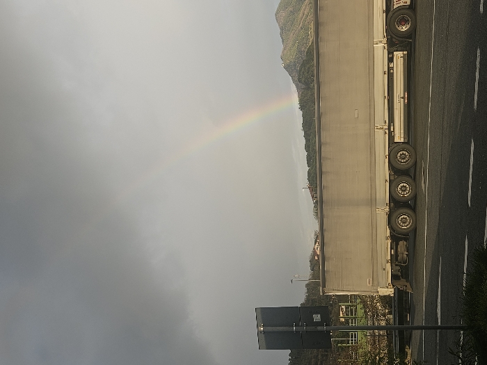 The image displays a roadside scene in Sestri Levante, Italy, characterized by a large vehicle and atmospheric conditions. A light-colored semi-trailer truck occupies the midground, positioned horizontally on a paved road. The truck's trailer features multiple axles with dark wheels and a corrugated side facing the viewer. The road in the immediate foreground exhibits white dashed and solid lane markings. To the far left, a dark vertical pole supports two rectangular, non-descript signs. The background consists of a mountainous landscape under a mixed sky. On the left side, green, forested hills are visible, dotted with scattered residential structures. To the right, a prominent, rugged mountain peak rises, partially illuminated by sunlight. The sky transitions from a dense, dark overcast on the left to a lighter, brighter grey on the right. A distinct, colorful rainbow arc is visible in the upper right quadrant of the sky, appearing to descend towards the illuminated mountain peak. No individuals are present in the frame, and the truck appears to be stationary or in transit.