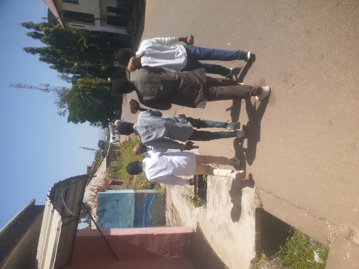Four individuals, appearing male, are observed from behind walking away from the camera on a paved road under clear, bright daylight in Jos, Nigeria