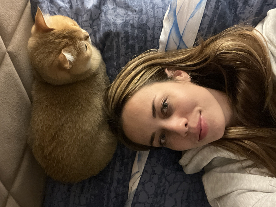 A woman with highlighted, wavy brown hair lies on her side on a patterned blue and gray bedspread. She's smiling slightly at the camera. Next to her, resting on a cream-colored headboard, is a golden brown cat. The cat's back is towards the viewer, showing its head and furry body. The scene appears cozy and intimate, capturing a moment of rest and companionship.
