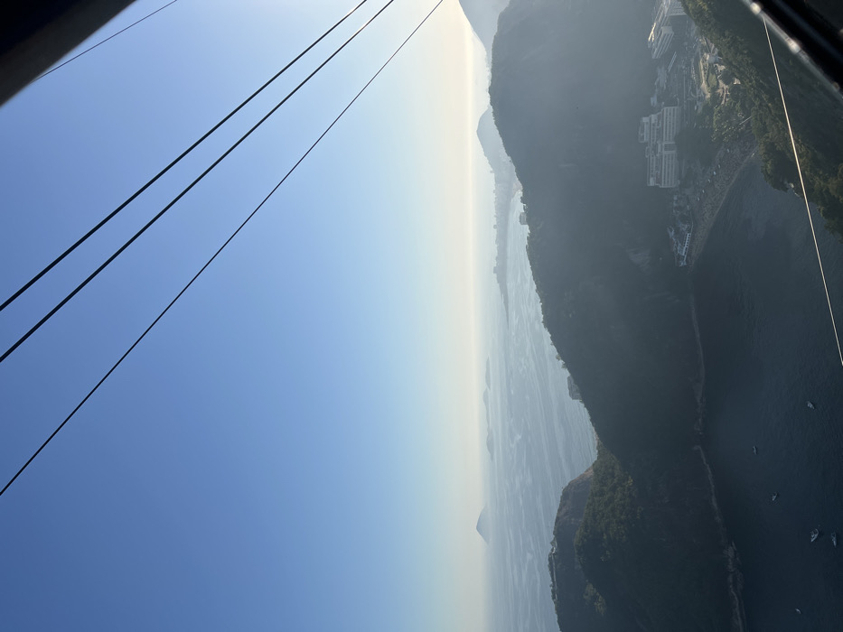 A high-angle view captures a coastline under a hazy sky. The landscape features lush, green hills meeting the water's edge, contrasted by a hazy expanse of water stretching to the horizon. Cable lines stretch diagonally across the upper left of the frame. Buildings are visible along the coastline. The scene suggests a viewpoint from a high vantage point, potentially a cable car ride.