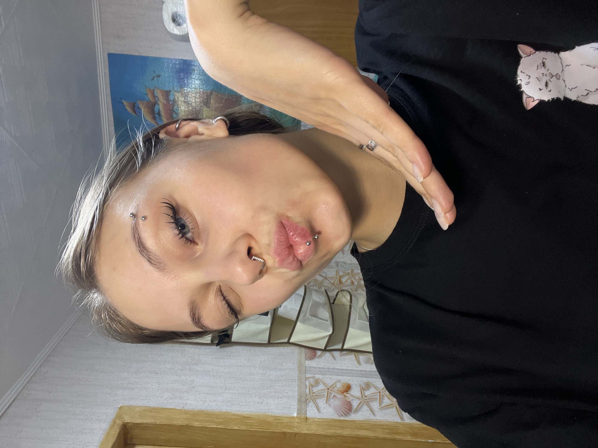A selfie shows a person with fair skin, light brown hair, and several piercings. The person is wearing a black t-shirt with a white cat graphic. The person is making a kissing face. The background is a tiled wall with a decorative border featuring seashells and starfish. There is also a framed picture of a sailing ship on the wall. The location is Фоки, Russia.
