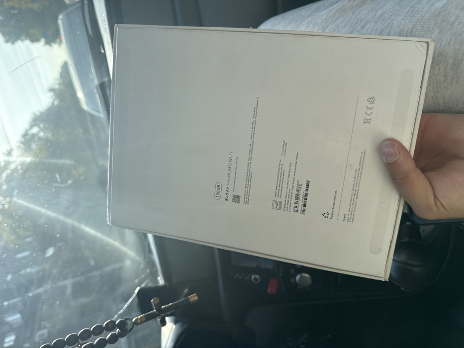 - "A person's right hand, wearing a light grey garment on the leg, holds a new, sealed white box for an "iPad Air 11-inch (M3) Wi-Fi" with 128GB storage, specified as Space Gray, model A2898, UPC 195949597246, and serial number QX7K2Y07G4, assembled in Vietnam" by FM-tnWi32, licensed under CC BY 4.0