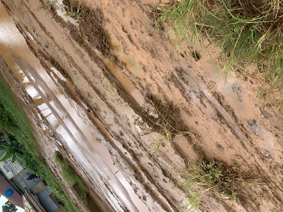 The image displays a severely degraded, unpaved road in Kafanchan, Nigeria, specifically near a location identified as "ADJ
