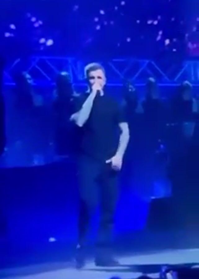 A man is singing on stage in front of a group of other people. The man is wearing all black and has tattoos on his arms. He is holding a microphone to his mouth with his right hand. His left hand is outstretched. The background is lit with blue light. The man is walking back and forth on the stage while singing. The people in the audience are holding up their phones to record the performance.