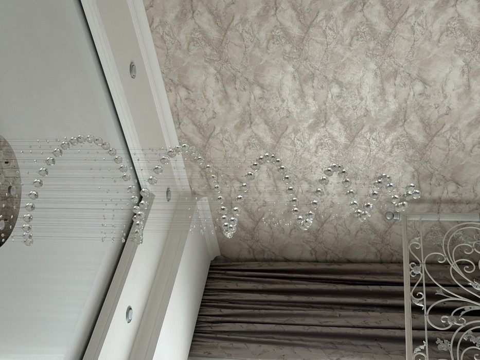 An interior scene within a building in the city of Ershov, Russia, depicts a residential or public space. The primary focal point is a large, multi-tiered chandelier, composed of numerous clear, faceted crystal spheres of varying sizes suspended by thin wires. These spheres descend in a prominent spiral configuration from a circular, polished metallic fixture mounted on a recessed section of a white, multi-level ceiling. Two silver-rimmed recessed spotlights are visible on the lower ceiling plane. The right wall features a light beige or brown wallpaper with a mottled, marble-like texture. To the left, dark brown or taupe-colored curtains hang in vertical folds, obscuring a window or wall section. In the lower left foreground, a section of an ornate, light-colored metal railing with decorative scrolls is visible, suggesting a staircase or balcony. No people are present, and no active actions or direct interactions are occurring. The environment appears well-maintained and furnished.