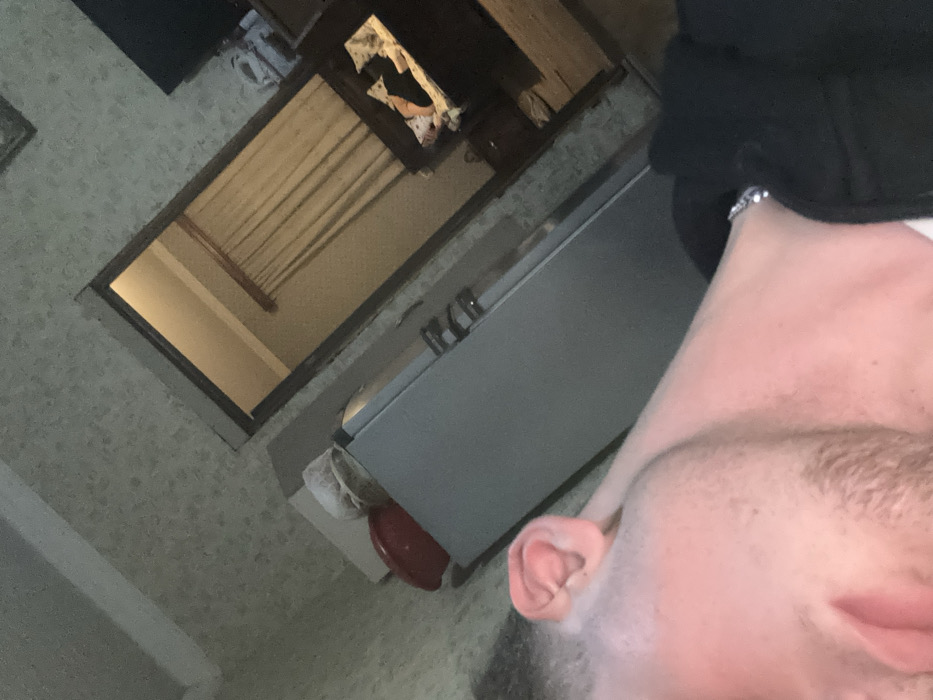 The image depicts an indoor scene in Durgena, Georgia, taken from a low-angle perspective. In the immediate foreground, the left side of a person's head, neck, and shoulder are visible. The person has fair skin, light-colored facial stubble along the jawline and chin, and is wearing a dark-colored garment that covers the shoulder and arm. A silver-colored link bracelet is present on the visible wrist. The background shows a room with light-colored, patterned wallpaper. To the left, a light-toned rectangular object, possibly a small cabinet or table, holds a red bowl and a white, crinkled object on its surface. Adjacent to this, a large, light-grey, rectangular appliance, resembling a refrigerator or tall cabinet, is positioned with horizontal handles visible. Further into the background, an open doorway reveals a portion of an adjacent room. This room has light-colored walls and a window covered by light-toned vertical blinds or curtains. Below the window, a dark-colored piece of furniture, possibly a dresser or console, is present, with a white, patterned fabric and other indistinguishable items placed on its surface. The overall lighting appears to be interior artificial illumination.