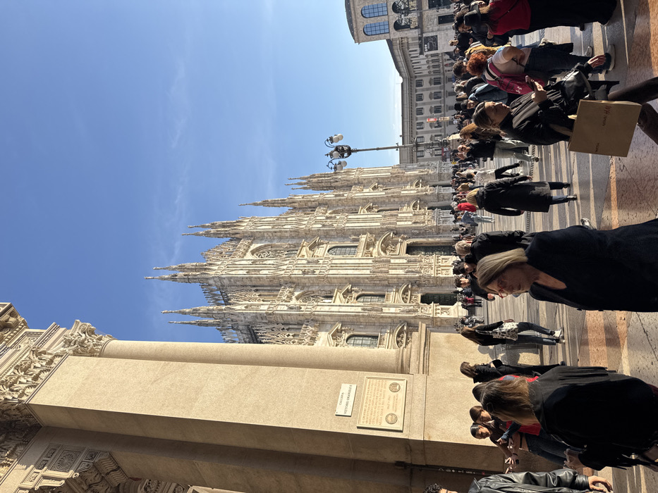 The Milan Cathedral stands tall against a clear blue sky, its intricate spires reaching upwards. A crowd of people fills the plaza in front of the cathedral. Some people are facing the cathedral, others are walking through the plaza. Part of a stone structure or archway is visible in the foreground.