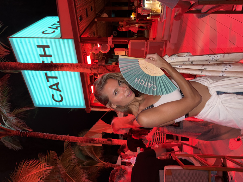 A woman holds a fan in front of a "Catch" sign, outdoors at night. She wears a white top and white pants, smiling toward the camera. Palm trees are visible in the lower left corner. Red lighting illuminates the background, which includes other people and part of a building. The fan has the text "Catch Beach Club" on it.