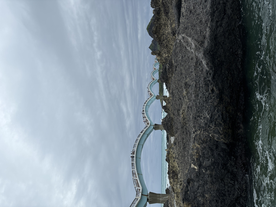 An infinity-shaped bridge spans a rocky coastline under a cloudy sky
