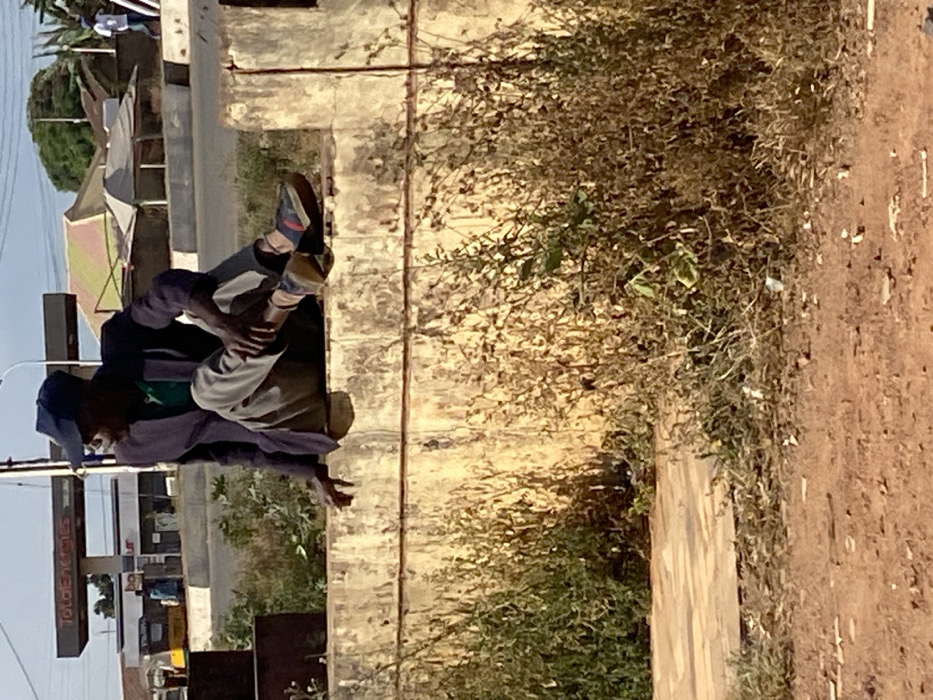 An elderly man sits on a concrete structure near a building displaying "Total Energies". He wears a blue cap, a purple shirt, and grey pants, with a green shirt underneath. He is holding his leg, possibly due to discomfort. Behind him is a wall covered in overgrown foliage. The scene is bathed in daylight, suggesting an outdoor setting near a roadside.