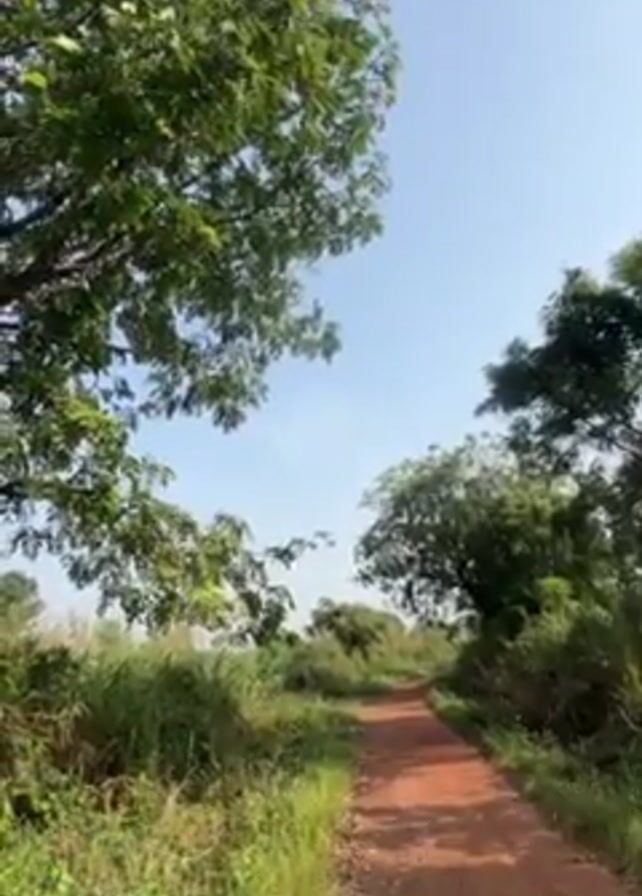 dirt road cutting through a grassy, overgrown area towards the horizon, flanked by trees on both sides under a clear, light blue sky. The road is reddish-brown and somewhat uneven. Tall green grass and other vegetation line the edges of the path, growing densely. Trees are visible on the left and right, their leaves forming a canopy overhead. The sky is predominantly clear with only a hint of haze, suggesting it might be a sunny day.