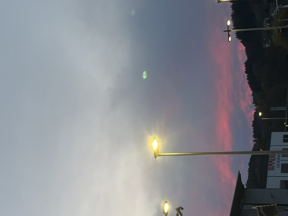 This image depicts an evening or dusk scene in Oppenau, Germany. The sky is largely overcast, featuring a prominent horizontal band of vibrant pink and red clouds stretching across the lower portion, transitioning to purple and grey tones higher up. A faint, diffuse green light anomaly, shaped somewhat like a butterfly or two interconnected ellipses, is visible in the upper-middle right quadrant of the sky. In the foreground, from left to right: - The upper section of a building with a light-colored, possibly corrugated metal, facade is visible on the far left. A sign on this building displays the text "BIMMERLE" and "EDELBRÄNDE," identifying the location as the Bimmerle KG distillery in Oppenau. - A partially obscured streetlight with a bright yellow-orange glow is present on the far left, behind some dark tree foliage. - A tall, slender streetlight stands in the left-center, emitting a strong yellow-orange light with a visible lens flare. - Further to the right, two additional streetlights with similar yellow-orange illumination are visible, set against the backdrop of the sky and hills. The background consists of dark, densely forested hills that rise against the horizon on the right side of the image, silhouetted beneath the colorful sky. No individuals or specific actions are discernible within the frame.