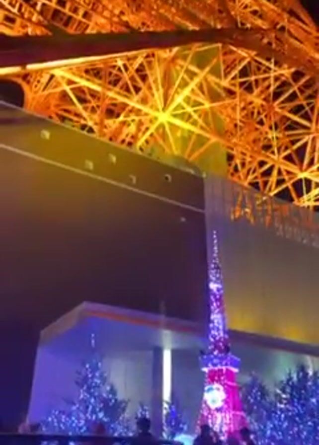 Tokyo Tower at night, illuminated in orange. At the base of the tower, a small replica tower stands illuminated in purple, pink and blue. Several trees with blue lights are also visible, and a group of people stand behind a railing looking at the displays. The camera pans upwards, showing the full height of the tower.