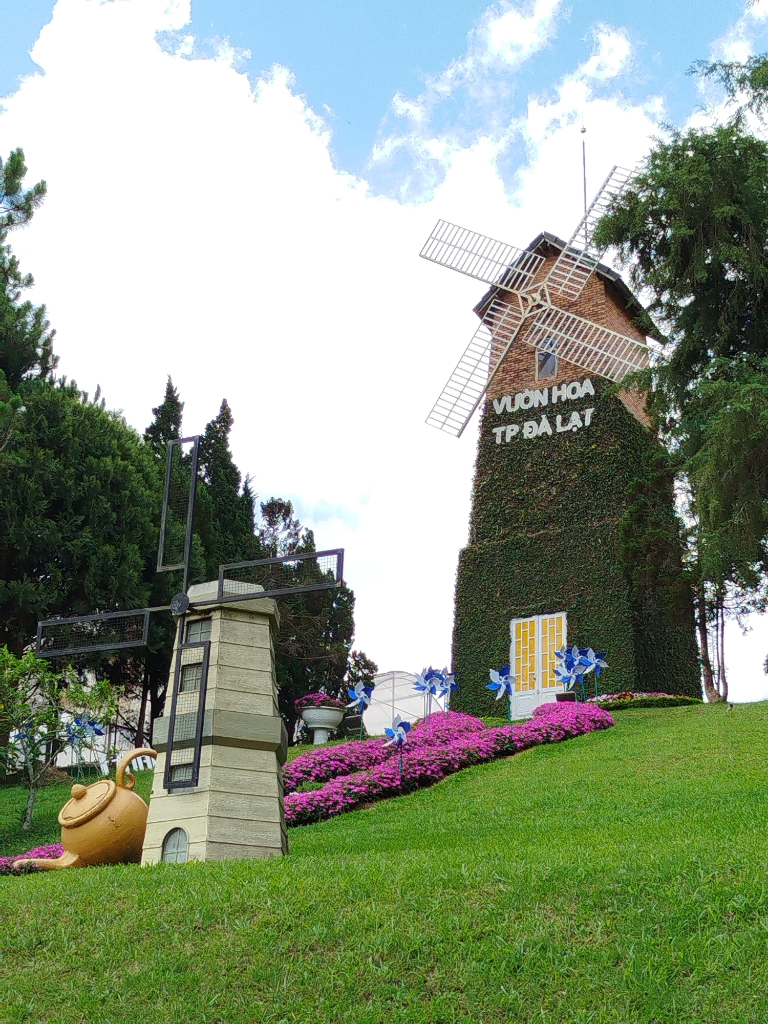 landscape in Lam Vien - Da Lat, Vietnam. There are two windmills, one large and covered in greenery with the sign "VUON HOA TP DA LAT" at the top, and a smaller, tan-colored windmill with black blades. A large, gold-colored teapot is situated in front of the smaller windmill. A row of purple flowers and blue and white pinwheels line the grassy slope leading up to the larger windmill. Trees are visible in the background, and a blue sky with white clouds is above.