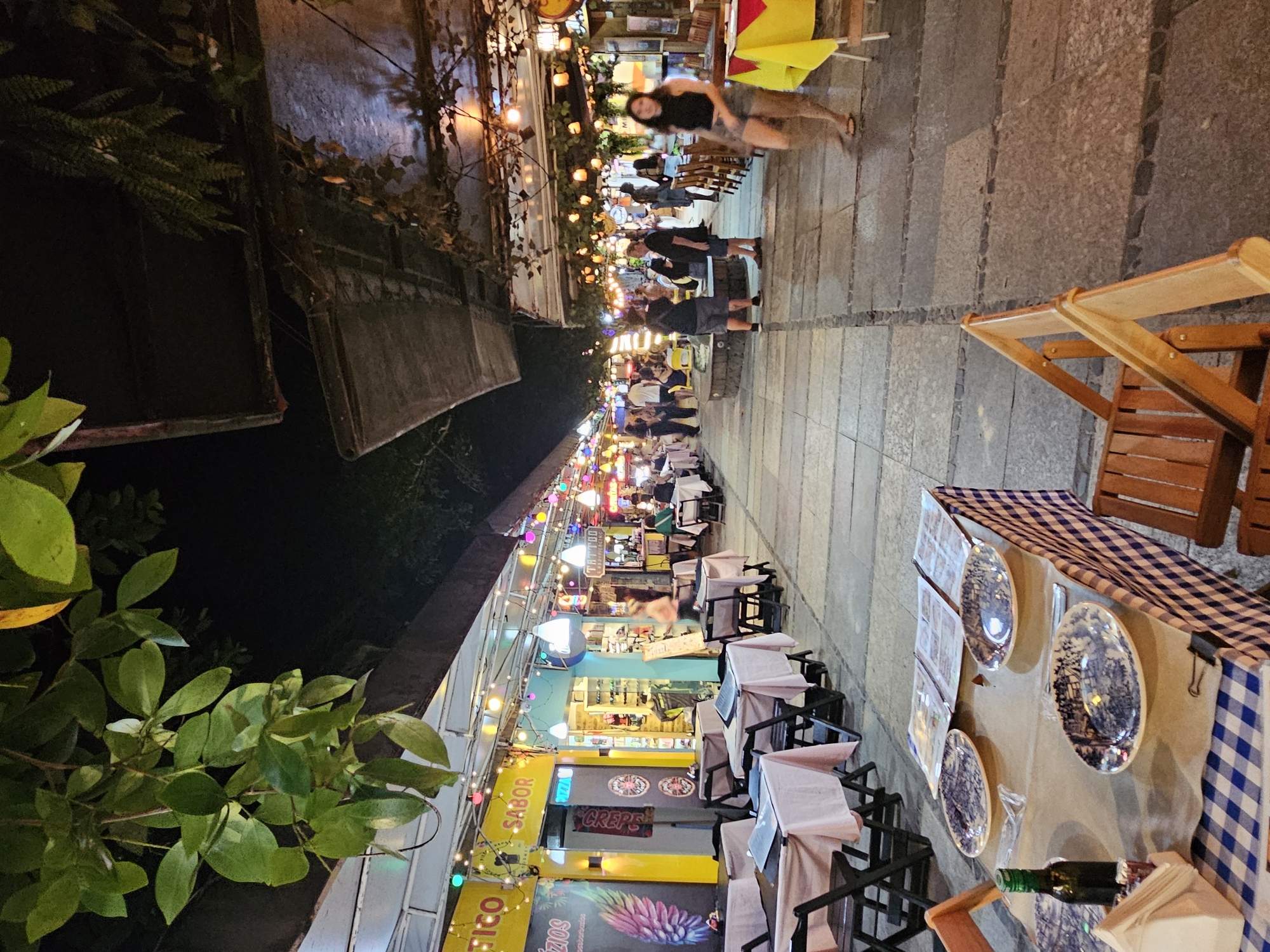 This outdoor shot depicts a night scene in Armação Dos Búzios, Brazil. The image is taken at street level, looking down a pedestrian walkway lined with restaurants. Patrons stroll down the walkway, their figures illuminated by string lights. Dining tables are set up, covered with checkered tablecloths and plates. Several people are walking on the right side of the walkway. The restaurants are brightly lit with neon signs, showing the names of different places to eat. Vegetation, like tree branches and leaves, frames the left edge of the image.
