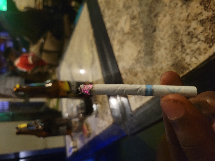 The image depicts an indoor scene within a bar or lounge setting in Jos, Nigeria. In the foreground, a dark-skinned hand is holding a lit white cigarette, identifiable by a light blue band and a white emblem near the filter, with its tip glowing bright pink from active combustion. The hand's thumb and index finger are visible. On a speckled, light-colored tabletop in the midground, two blurred brown beer bottles are present; one prominently displays a yellow and dark label (resembling "TIGER" beer), and another is positioned further back. A clear glass containing a dark liquid and a small white rectangular object (possibly a cigarette pack or lighter) are also on the table. The background is indistinct but shows several blurred figures, including one individual in a red shirt with white markings. The overall lighting is dim, suggesting an evening or nighttime environment, with a blue ambient light source visible on the far left.