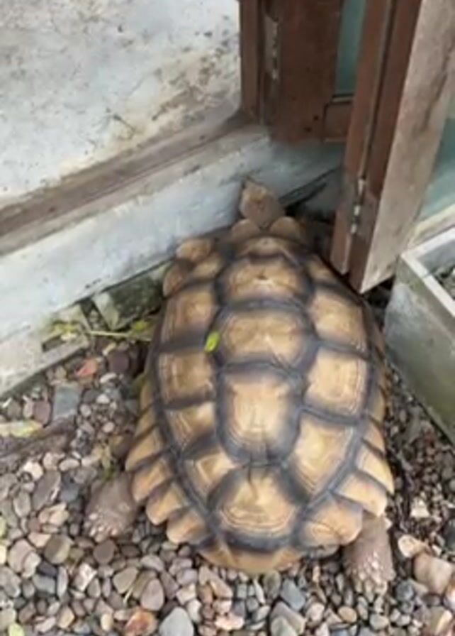 tortoise near a building's corner. The tortoise has a patterned brown shell and stands on a bed of small gravel. It's positioned next to the edge of a concrete wall, a wooden door frame, and a glass window. There are some small green leaves scattered on the gravel, close to the tortoise.