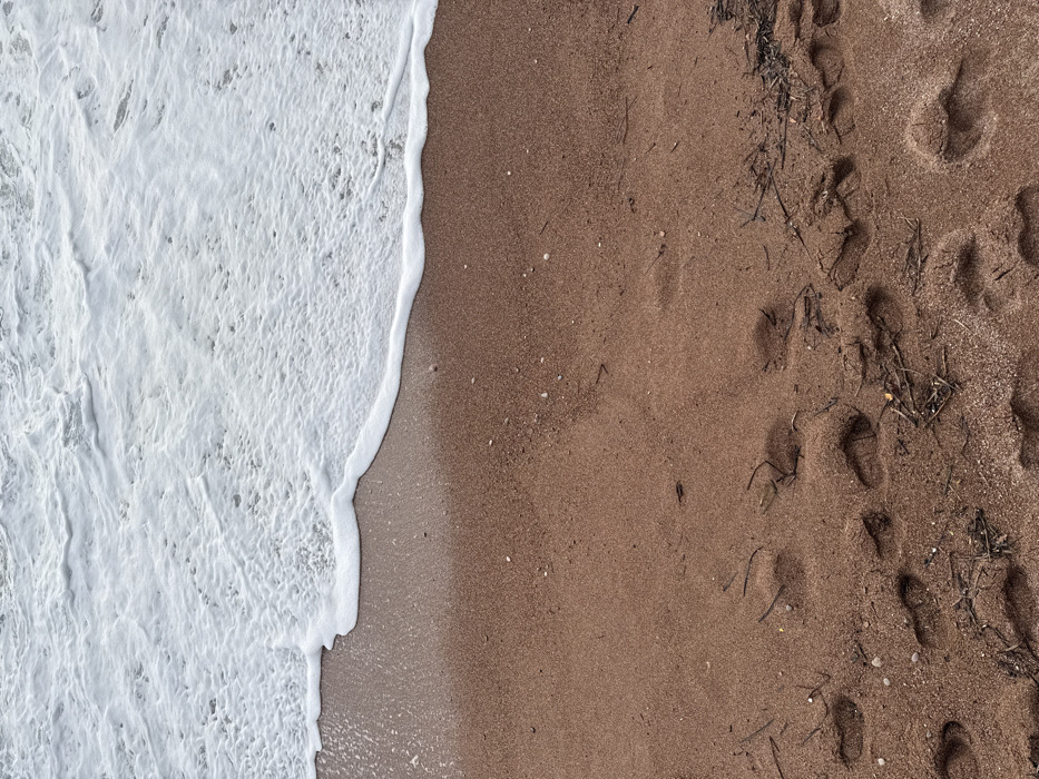 The image displays a detailed view of a sandy beach in Petrovac centar, Montenegro, from an elevated perspective. The upper section of the frame is dominated by ocean water, characterized by turbulent white foam from breaking waves. This foam forms a distinct, irregular line as it recedes from the shore. The lower section of the frame consists of reddish-brown sand, which exhibits numerous distinct impressions consistent with human bare footprints. Scattered across the sand and intermingled with the footprints are small accumulations of dark, dried organic debris, resembling seaweed or plant matter, along with a few small, light-colored pebbles or shell fragments. No individuals are present in the visible scene. The interaction between the ocean and the shore is evident through the wave foam and the wet sand at the immediate waterline.