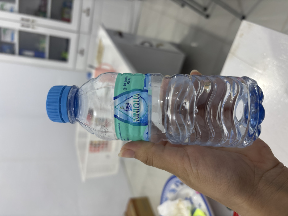 A hand holds a partially filled, horizontally oriented plastic water bottle. The bottle has a blue cap and a green and blue label with the word "AINIQUA." The bottle's shape is slightly curved with wavy indents along its length. In the blurred background, a kitchen is visible, including cabinets, a white counter, and a dish with food remnants.
