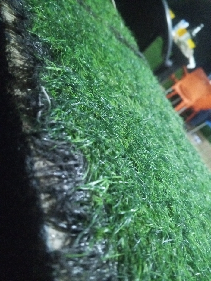 Artificial turf covers the majority of the image. The turf transitions from a dark, shadowed edge on the left to a brighter, greener expanse as it recedes. Blurry shapes of a black chair and an orange chair are visible in the distance, suggesting an outdoor setting. The lighting appears dim, contributing to the shadows and blurry details.