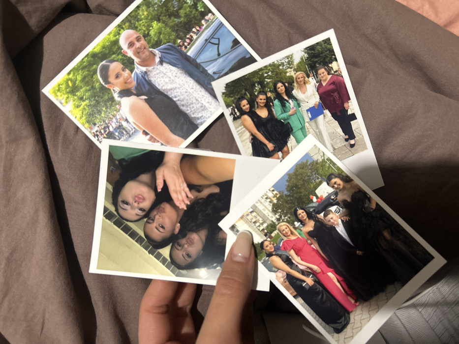 The image displays a hand holding one instant photo, while four other instant photos are scattered on a brown textured fabric surface. The photo held in the hand, positioned top-left, shows three young women in a selfie. All have dark hair and are making a "pout" or "kissing" expression. The woman on the right wears a green top, and the other two wear dark attire. The background is an indistinct indoor setting with light vertical panels. To the top-right, a diagonally oriented photo features a man and a woman standing outdoors, smiling with their arms around each other. The woman, on the left, has dark hair pulled back and wears a dark sleeveless top. The man, on the right, is bald and wears a patterned white and blue shirt under a dark jacket. The background includes green trees, a crowd of people, and the rear of a dark-colored car, indicative of a public gathering in Plovdiv, Bulgaria. At the bottom-left, another diagonally oriented photo captures a group of six individuals—five young women and one young man—posing outdoors in formal wear. The women are in various long gowns (black, red, pink), and the young man wears a black suit. They stand on a paved area next to a white car. In the background, multi-story residential buildings with balconies, characteristic of urban architecture in Plovdiv, Bulgaria, are visible, along with trees. To the bottom-right, a fourth visible photo, also diagonal, depicts four women standing outdoors on a paved surface. One woman wears a dark short dress, another a green pantsuit holding a blue document folder, a third a white top and light pants, and a fourth a maroon long-sleeved top and dark pants. Trees and buildings are in the background, consistent with an urban setting in Plovdiv, Bulgaria.