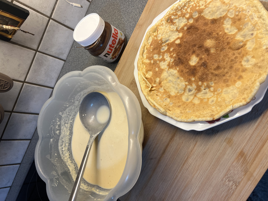 This image depicts a domestic kitchen interior, presumably located within Gerakas Municipal Unit, Greece. The scene is presented from a slightly elevated, downward-angled perspective, focusing on a food preparation area on a wooden surface. A translucent, fluted plastic mixing bowl, occupying the upper-left quadrant, contains a substantial quantity of pale yellow, liquid batter, consistent with pancake or crepe mixture. A silver metal ladle rests within the bowl, partially submerged in the batter. To the right of the mixing bowl and behind the foregrounded crepes, a glass jar of Nutella with a white plastic lid is positioned on a dark, speckled countertop. The "Nutella" brand label is clearly visible. In the lower-right portion of the frame, a stack of freshly prepared, circular crepes or thin pancakes is arranged on a white, scalloped-edge plate. The crepes exhibit a golden-brown coloration with darker, irregular patches from cooking. The background consists of a dark speckled countertop transitioning to a tiled backsplash featuring light square tiles with dark grout lines. Above the countertop on the far left, a dark fabric item, possibly an oven mitt, hangs. On the far right, a dark, rectangular object, possibly a framed item, is visible hanging on the wall, with a white charging cable dangling beneath it. No individuals are present in the image. The scene suggests an active or recently completed cooking process.