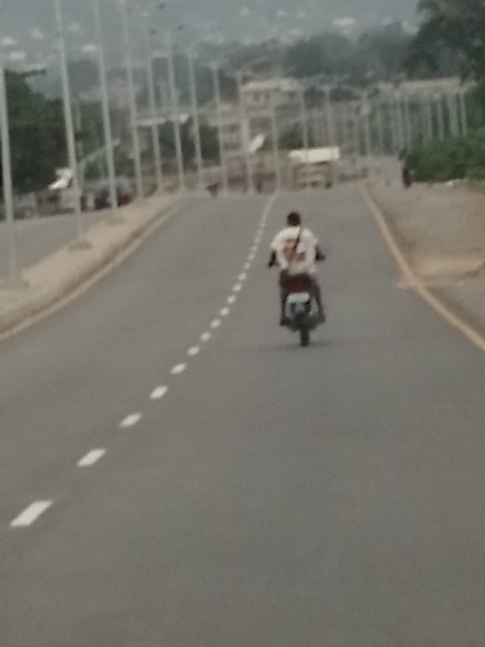 An individual is operating a motorcycle, viewed from the rear, traveling on a paved two-lane road in Otokiti, Nigeria