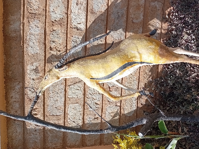 A three-quarter view captures a tan, gazelle-like statue, approximately life-sized, depicted in an upright stance on its hind legs