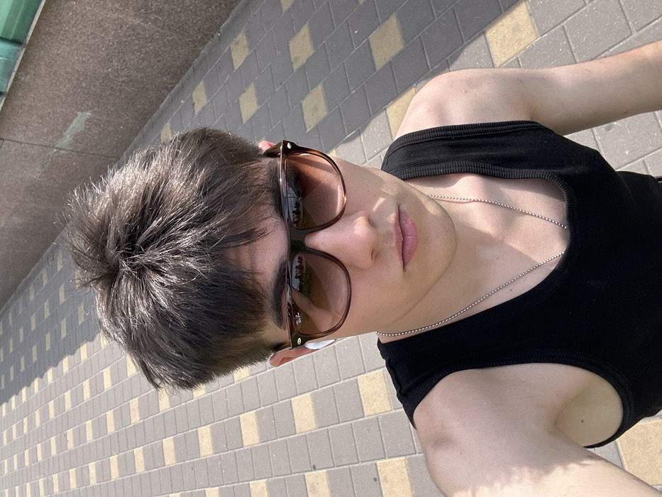 A fair-skinned person with short, dark hair and wearing brown Ray-Ban sunglasses is angled towards the camera. They have full lips and are wearing a black tank top and a silver ball chain necklace. The background is a paved area with light and dark rectangular blocks. The sunlight suggests an outdoor setting. The subject's positioning and the camera angle imply a selfie.