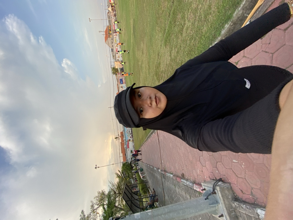 A young adult woman in a black hijab and a black military-style cap captures a selfie in a public park in Sumorame, Indonesia, during what appears to be late afternoon