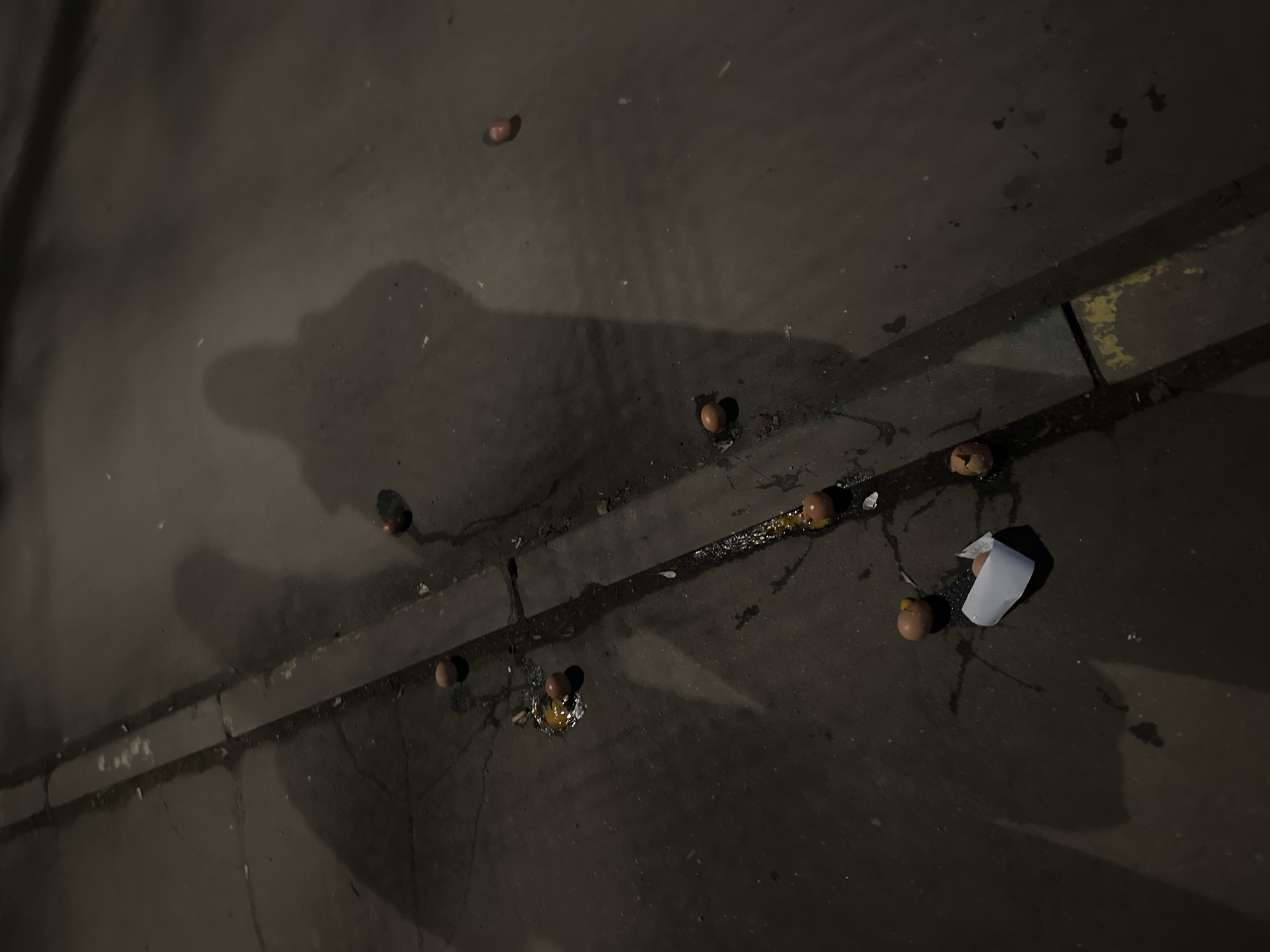 section of street or sidewalk in a poorly lit environment. Scattered across the surface are a number of broken eggs, some with yolks and whites visible, and some with shell fragments. There is also a piece of white paper or plastic amidst the debris. A shadow of a person is cast across the surface. The location is unspecified and cannot be determined from this image.