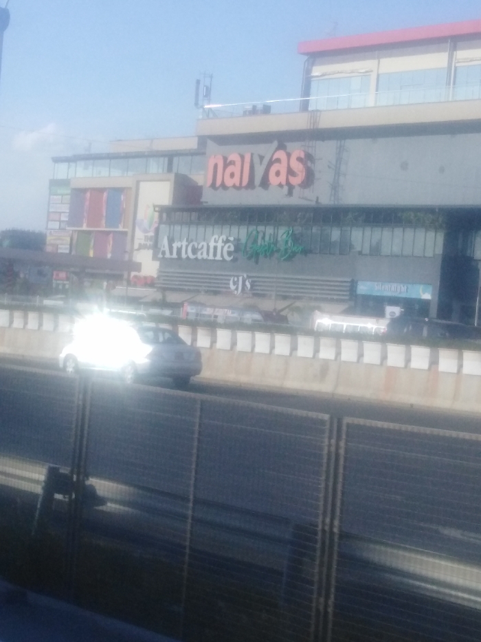 A multi-story building with the brand name "Nalyas" prominently displayed on its exterior. Below, an "Artcaffe" sign is visible. The building appears to house several other businesses including CJ's. A highway runs in front of the structure, with vehicles traveling on it. A grey metal fence is in the foreground, obscuring some of the view. The sky is overcast, and the light is bright.