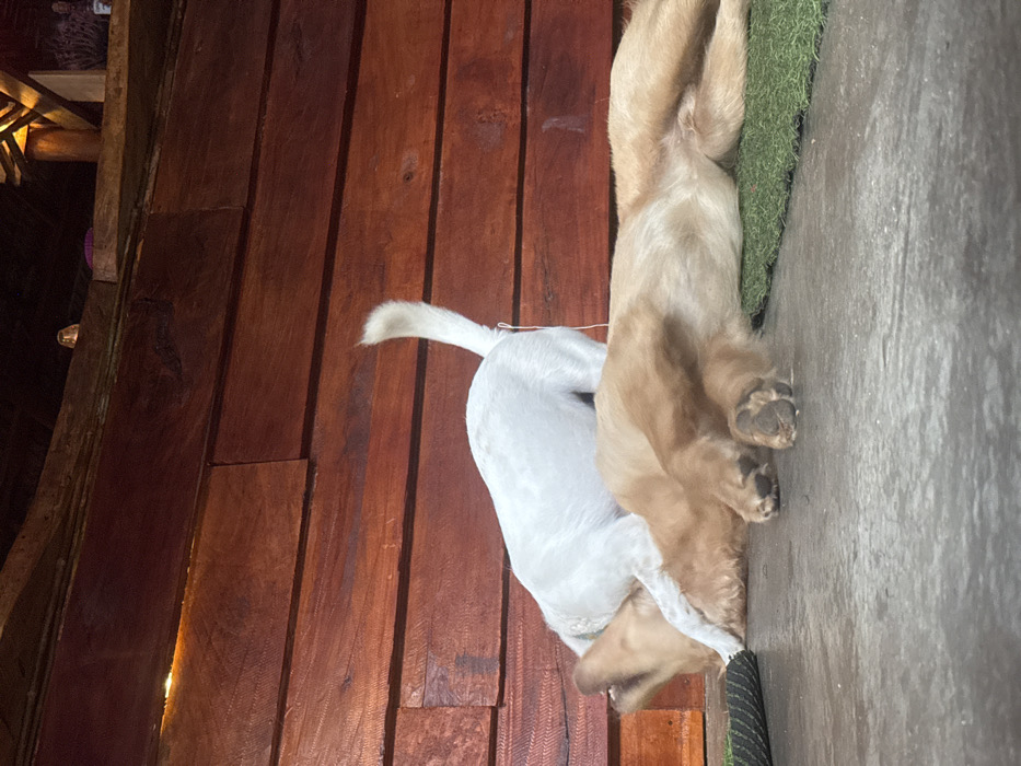 Two dogs are on an outdoor surface. One is golden, lying on its back with paws facing upward. The other is white and stands beside it. Both appear to be resting. The dogs are near a brown wooden wall. A patch of green artificial turf is adjacent to one dog. The image is taken from an elevated perspective.