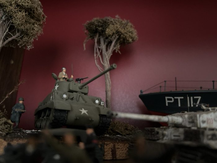 This image depicts a military diorama, an artificial scene of miniature figures and vehicles, displayed indoors in Truchtersheim, France. In the mid-ground, a dark green M4 Sherman tank model, marked with white stars, is positioned centrally, its turret slightly rotated, and a .50 caliber machine gun mounted. A miniature figure of a soldier, wearing a tan uniform and helmet, is visible from the waist up in the tank's open commander's hatch, holding binoculars. To the left of the Sherman, a second miniature soldier figure, clad in a dark blue-green coat and helmet, stands on uneven terrain, holding a rifle. In the blurred foreground on the right, a light grey armored tank model, possibly a German Tiger I, is partially visible, oriented towards the right with its main gun barrel extended. In the background on the far right, a dark-hulled PT boat model is visible, featuring the white designation "PT 117" on its side. Two miniature trees, with sparse, brownish-green foliage, frame the scene on the left and center-right. The backdrop is a solid, reddish-maroon wall. The diorama base is textured with dark brown and lighter grey material, simulating uneven ground.