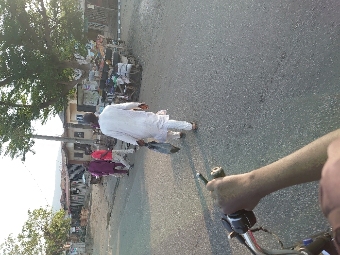A street scene shows a person riding a bicycle, their arm and hand visible on the handlebar. Ahead, a man in a white robe walks along the street. Another individual, wearing a red shirt, is also seen. Street vendors and small shops line the roadside, with a large tree providing shade. The asphalt road is cracked, and a mountain is visible in the distance.