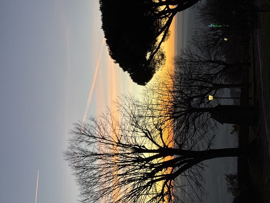 The image depicts a panoramic view at sunset or dusk from a high vantage point in Cortona, Italy, overlooking the Val di Chiana. The sky transitions from a light blue-grey at the zenith to bands of pale yellow and orange near the horizon. Two white contrails are visible: one short and faint in the upper left, and a longer, reddish-orange contrail stretching diagonally from the upper left-center to the mid-right. In the foreground and mid-ground, multiple trees are silhouetted against the vibrant sky. A large, bare deciduous tree with extensive branching dominates the left side. Several smaller, similarly bare deciduous trees are positioned to its right. On the far right, a large, dense coniferous tree, likely a Stone Pine, with a distinct umbrella-shaped canopy, is silhouetted. Man-made objects include a classic-style streetlamp with a glowing yellow light, located slightly right of center in the mid-ground. To its left, a dark, small, gabled structure, resembling a shrine or utility box, is visible. Further to the right, faint, colored lights, including one appearing green, punctuate the dark foliage. The distant landscape, the Val di Chiana, appears as a hazy, dark blue-grey plain with scattered, faint urban lights, extending to the horizon where the sunset glow is most intense. No people are present in the scene.