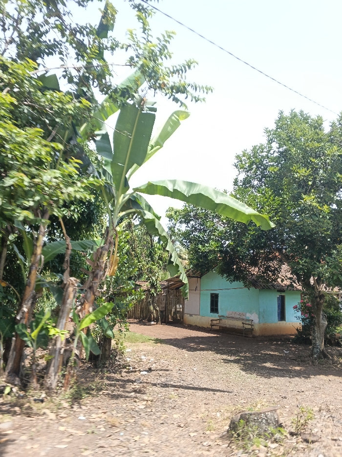 A rustic dirt road leads to a small, light blue house with a reddish-brown tiled roof. Lush green trees and a banana plant frame the scene. A wooden bench sits outside the house. A simple wooden fence extends from the house, and an electrical wire is visible in the sky. The overall impression is of a simple, rural dwelling.