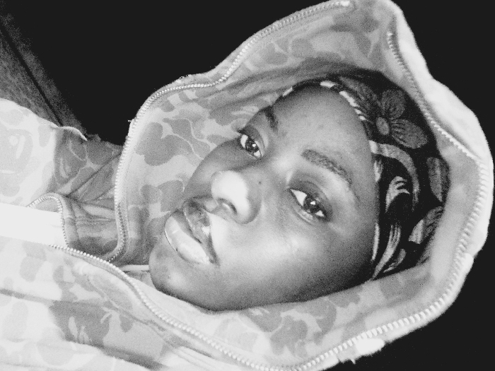 A monochrome close-up depicts a person wearing a patterned hoodie, the hood framing their face. They gaze directly at the camera with a serene expression. A headscarf is visible beneath the hood. The image's soft lighting highlights the contours of their face and the textures of the clothing. The background is dark, emphasizing the person as the central subject.