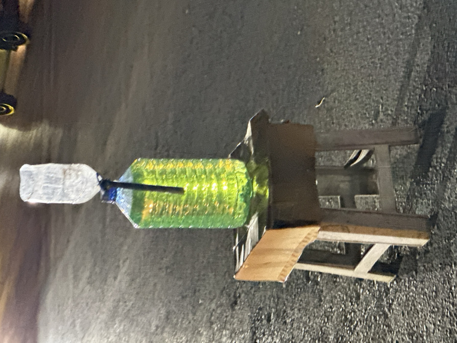 The image depicts a makeshift fuel dispensing station at night in Al-Qanawat Municipality, Syria. A large, ridged, translucent green plastic bottle filled with a luminous yellow-green liquid (consistent with fuel) sits atop a small, light-colored wooden stool. The stool's top is covered with a piece of brown cardboard. An inverted, clear plastic bottle, modified to act as a funnel, is attached to the opening of the green bottle. A dark-colored tube or hose extends from this funnel assembly into the liquid inside the green bottle. The setup is positioned on a dark asphalt surface, which reflects artificial light sources. In the blurred background, reflections of vehicle lights or wheels are visible on the asphalt. No individuals, direct actions, or interactions are visible in the scene.