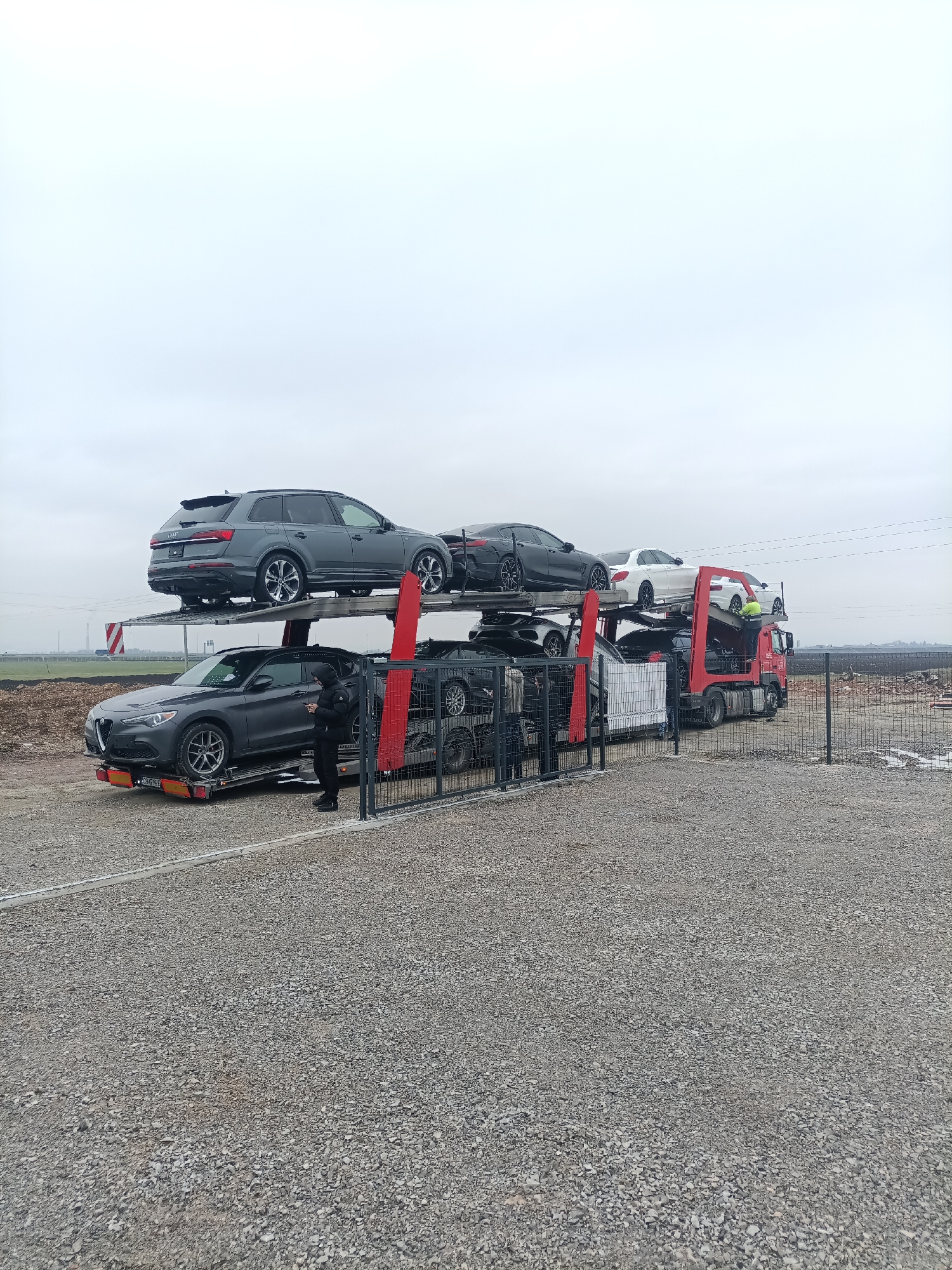car carrier trailer parked in a gravel lot near a chain-link fence, ostensibly in Mramor, Bulgaria. The car carrier is transporting several vehicles, including a gray Audi SUV on the top level, a gray Alfa Romeo SUV on the bottom level closest to the viewer, and other sedans of varying colors in between. A person dressed in dark clothing stands near the Alfa Romeo, possibly interacting with a mobile device. The sky is overcast, and in the background, there's a glimpse of barren land or construction materials. The location appears to be an industrial or storage area on the outskirts of Mramor.