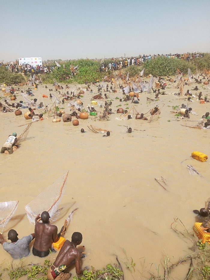 The image depicts a large-scale communal fishing event in Kokani North, Nigeria
