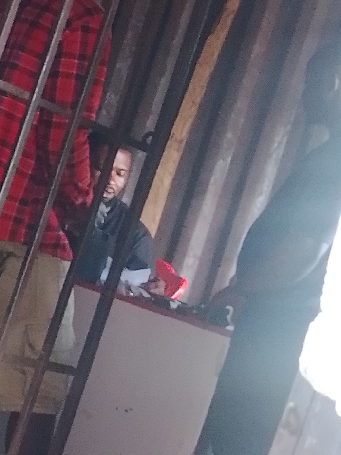 The image depicts an indoor scene in Adankolo, Nigeria, viewed through vertical and diagonal dark metal bars, possibly part of a cage or structural framework