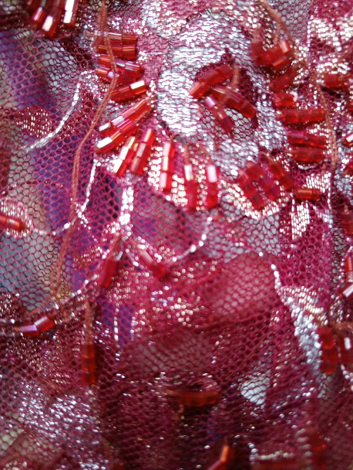 Close-up image showcases a textured textile, primarily colored in shades of red and silver. The fabric features a netting pattern, layered with an ornate design. Red beads are sparsely attached, creating a subtle shimmer. The silver embellishments appear to form floral or leaf-like motifs. The overall aesthetic conveys a sense of luxury and craftsmanship.
