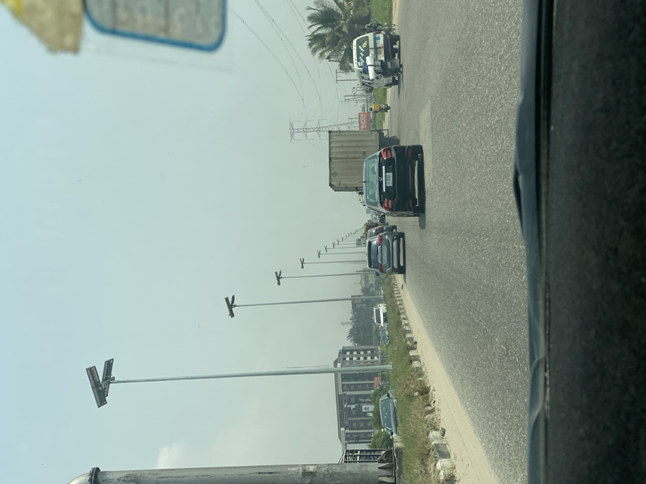 The image depicts a multi-lane asphalt roadway in Igboefon, Nigeria, viewed from inside a vehicle looking forward through the windshield and over the dashboard