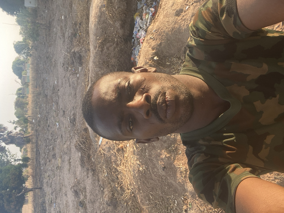 A man in a camouflage shirt takes a selfie outdoors. The background features dry, straw-covered ground, trees, and a mound of trash. Harsh sunlight casts strong shadows. The man's expression is neutral.